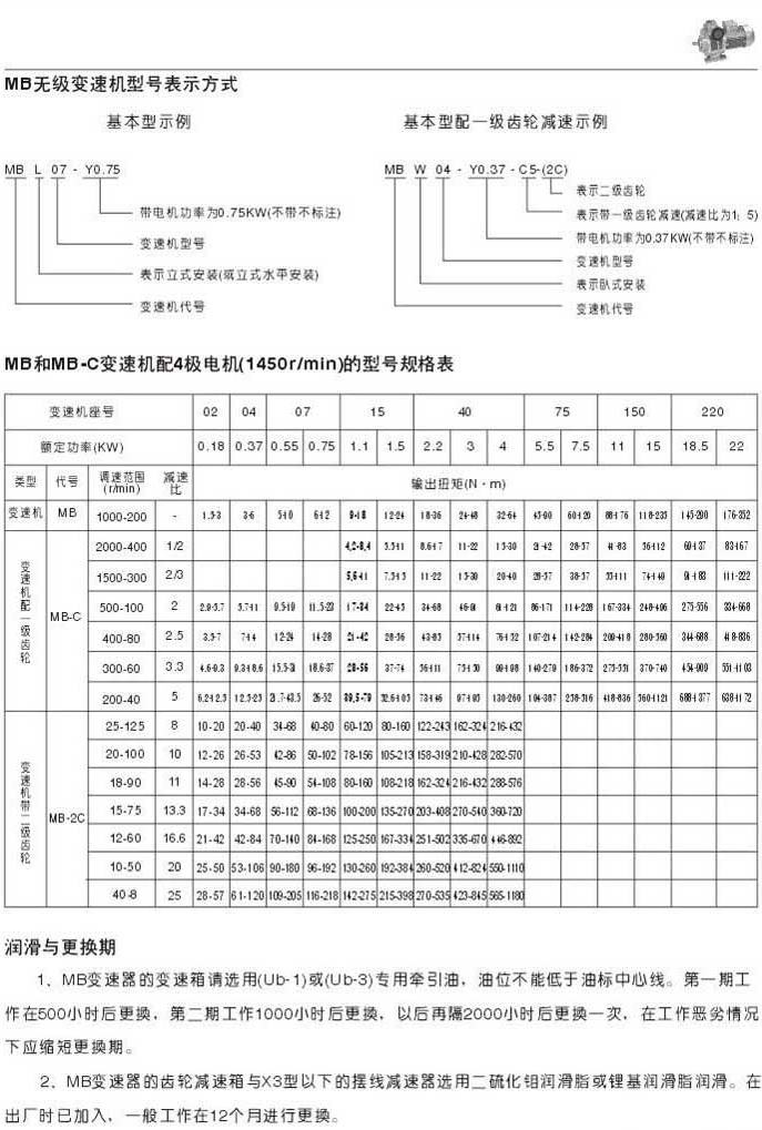 MB無級(jí)變速機(jī)型號(hào)表示法MB和MB-C變速機(jī)配4極電機(jī)(1450r/min)的型號(hào)規(guī)格表潤(rùn)滑和更換期