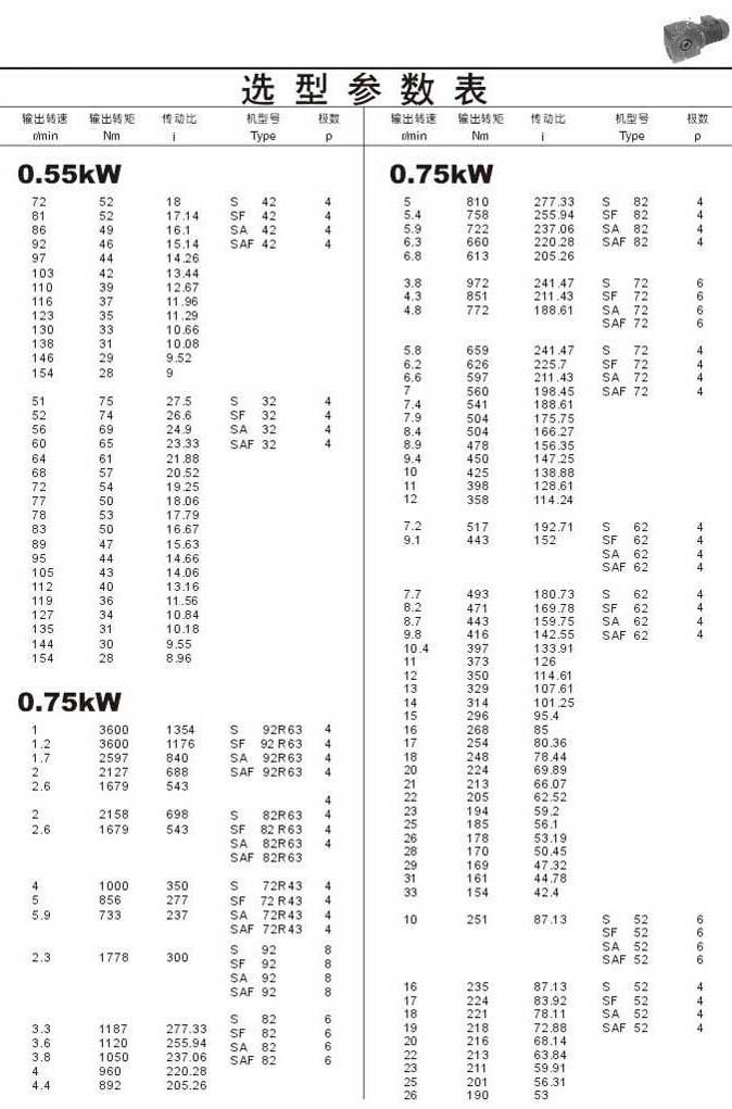 選型參數表0.55kW(續(xù))和0.75kW